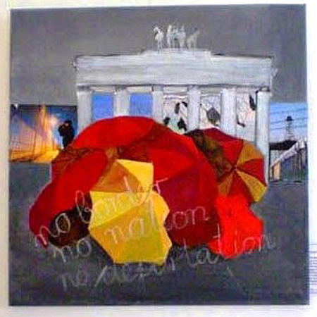 sich mit zwei großformatigen Bildern in Collage-Technik. Sie thematisierte