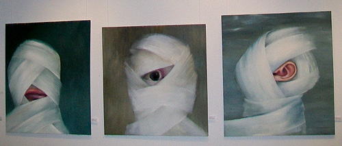 verwundete, bandagierte Köpfe, von denen man jeweils nur den Mund, ein Auge oder ein Ohr